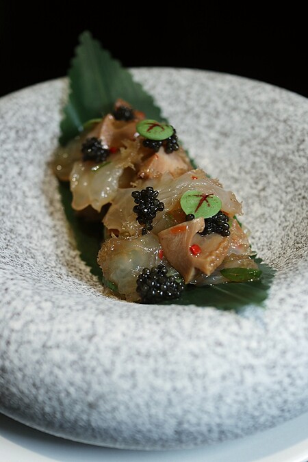 將蜇頭和紅燒風味8頭鮑各自費時發泡、蒸軟後,改刀分切,加入蔥花、辣椒且調味,潑上燒熱的自製香料油爆出香氣,放涼盛盤,飾以法國百年頂級品牌Punier的鱘龍魚子醬,香味繚繞,鹹鮮沖盪舌尖!