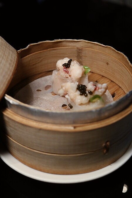 此為香宮點心部主廚陳崑裕招牌之作,使用波士頓龍蝦肉製作以生粉和澄麵依黃金比例調成的水晶皮裡,先包入八分滿、精心調拌的鮮蝦餡料,入籠蒸至半熟,再放上整塊現殺龍蝦肉,最後再次入蒸籠蒸熟,成品立體飽滿,吃來甘甜鮮美。