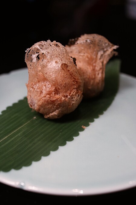 因廣西所產的荔浦芋品質優異,便以「荔芋」形容為好吃的芋頭,此道料理為傳統粵菜,主廚則將菜色改良成為精緻的港點,以水分較少的大甲芋頭製作,蒸透搗碎後加入澄麵、豬油,做成Q彈鬆軟的荔茸,冷藏後包入新鮮干貝後油炸,芋泥外酥內滑,玉帶鮮嫩,點綴法國魚子醬上桌。