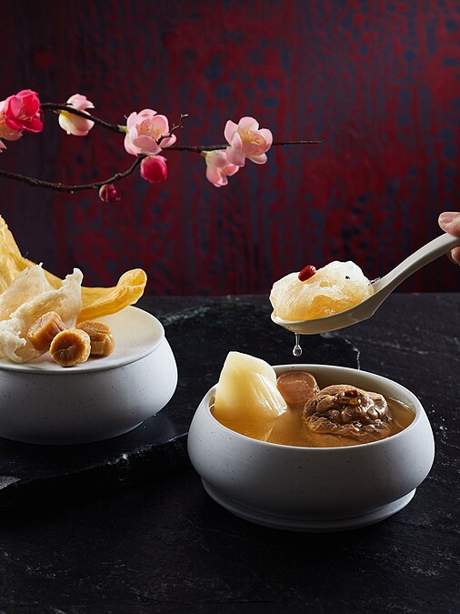 此為傳統廣式燉湯,三寶則為燕窩、花膠、瑤柱,是道展現乾貨發泡和煲燉湯水的功夫的湯品,製程相當繁瑣,食材得分別花費時間乾蒸、泡冷水、熱蒸放涼,最後與入焯水洗淨的去皮雞腿肉入籠蒸燉二小時,最後半小時才放上花膠,淋上紹酒上桌,湯品呈現金黃清澈的湯液,原料則相互風味交融,入口即化鮮潤迷人。