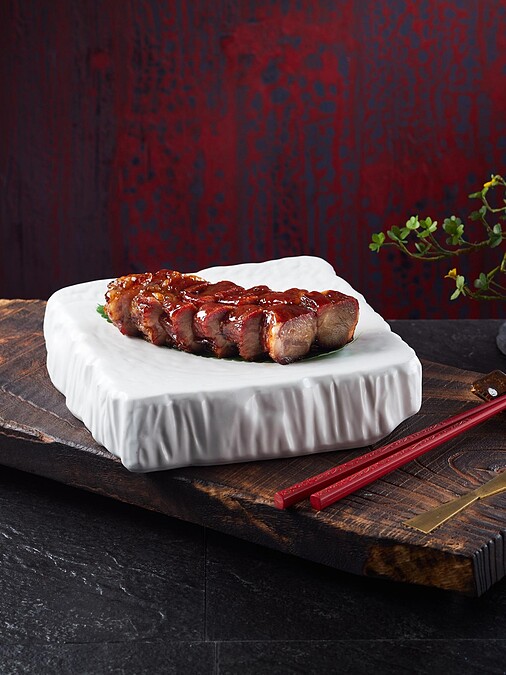 燒臘主廚鍾向選用西班牙伊比利黑豬梅頭肉部位,切出一定厚度的肉條,這得仰賴鍾主廚多年來的經驗,要在筋肉較密集處,以刀背略為敲鬆肌理,有助成品更為鬆嫩可口,接著醃製,除了能上色外也增加了味道層次,接著裹上麥芽糖增加光澤,爐烤完成,每一塊都甜美多汁,是香宮必點菜色之一。