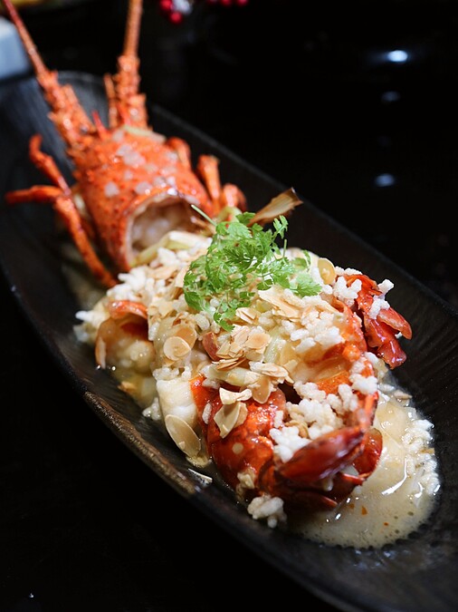 夏宮招牌菜也是主廚的拿手菜,將珍珠龍蝦整隻斬件後拍上生粉,炸至七分熟撈起;以牛油炒香洋蔥和青蔥,加入上湯後在下炸過的龍蝦,將湯汁收濃後再撒下現烤的杏仁片和現炸的酥鬆脆米,龍蝦鮮嫩彈牙,輔料裹了湯汁,香脆口感層次分明。