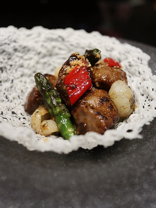 先備齊足量的黑椒粒、香葉及牛油,潑入滾燙的自製炒菜香油,煉得黑椒油為此道菜色的香氣來源,主廚選用脂肪雪花分佈適中的日本A4和牛,切塊後簡單以生抽、生粉略醃煎製封住肉汁,最後再與黑椒油與蒜蓉、干蔥、蘆筍和龍眼鮮肉快炒而成,嚐來鑊氣十足,還能吃到牛肉豐腴的滋味,以及迷人的龍眼果香。