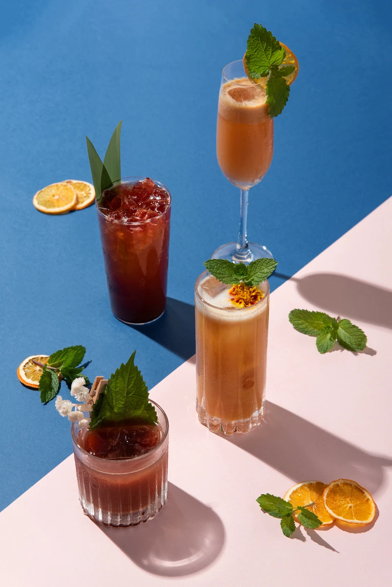 此次餐酒呼應餐點,在西方調酒中加入了東方元素,像是使用東方美人茶、杭菊、甘蔗汁與日式玄米茶,設計出四款風味各異的調酒,另外也有四款無酒精茶調飲:「荔枝泡泡」「玫瑰檸檬」「茉莉伯爵」和「燻香無花果」,皆以P&T柏林選茶為茶基底,調製出搭餐、獨飲都合宜的風味。甜點則有季節甜品「雪莓帕菲」,酸甜滋味大人小孩都會喜歡。