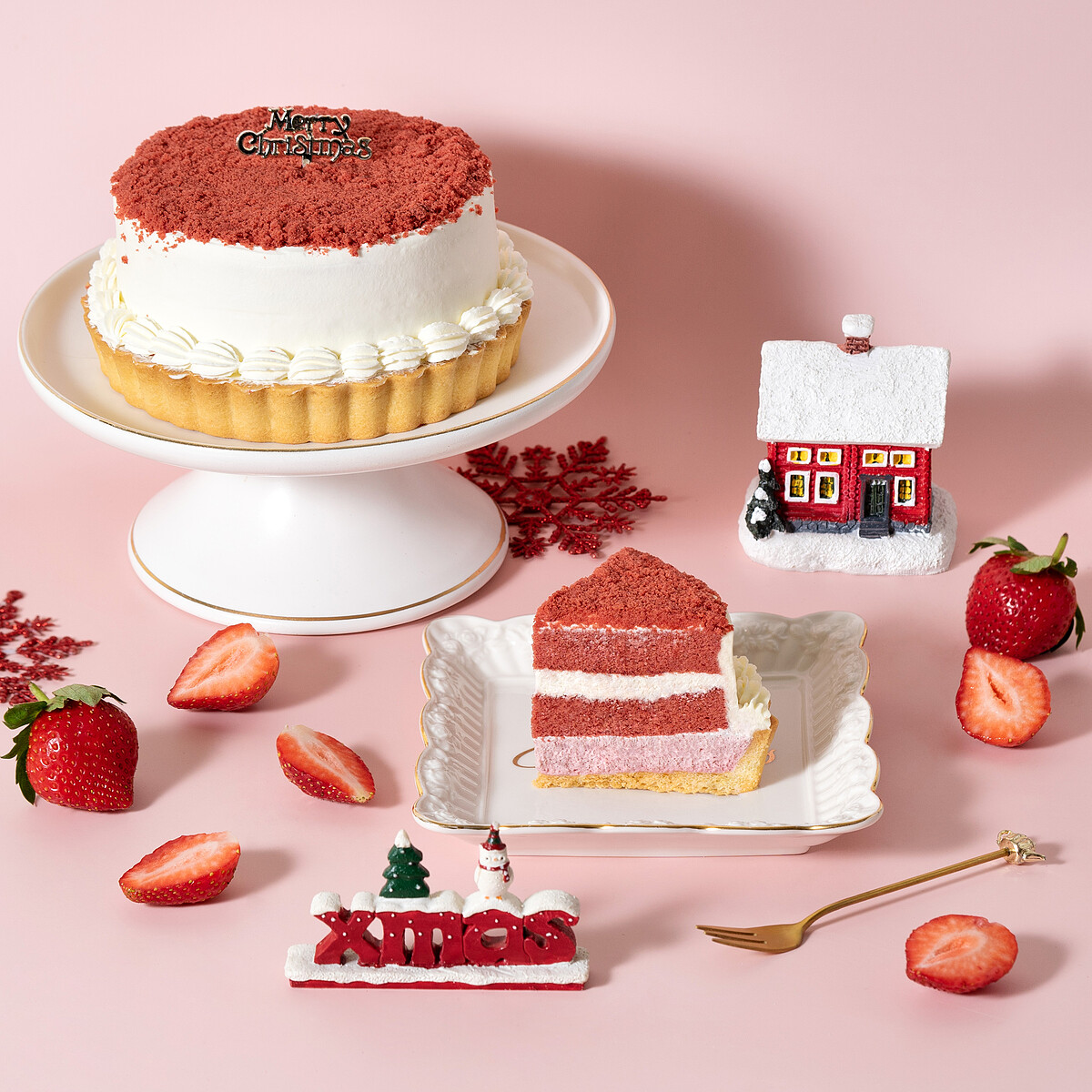 以紅絲絨蛋糕體搭配乳酪生乳餡,再包裹草莓提拉米蘇小樹,準備陪伴大家度過一個浪漫的聖誕節!此外