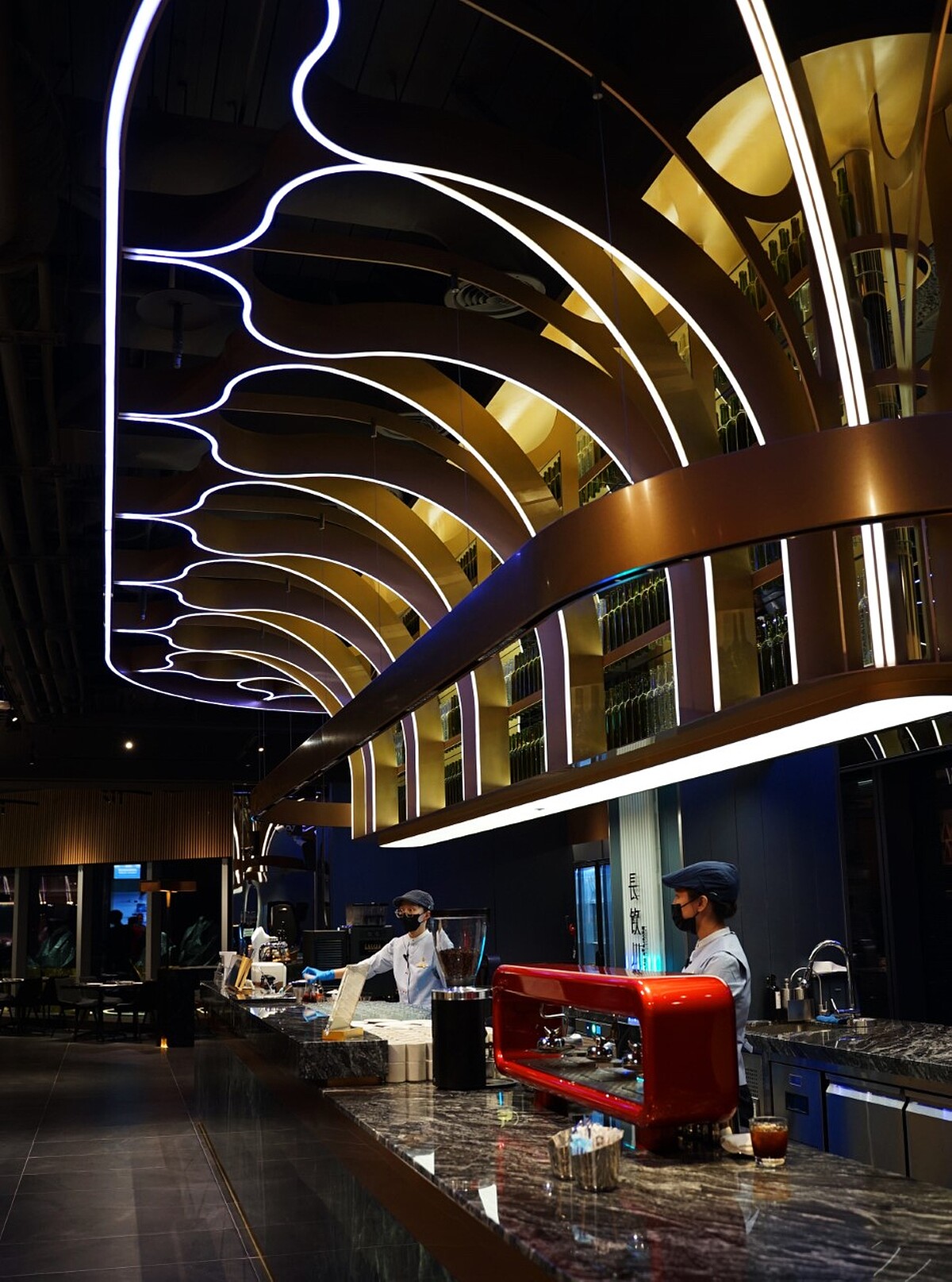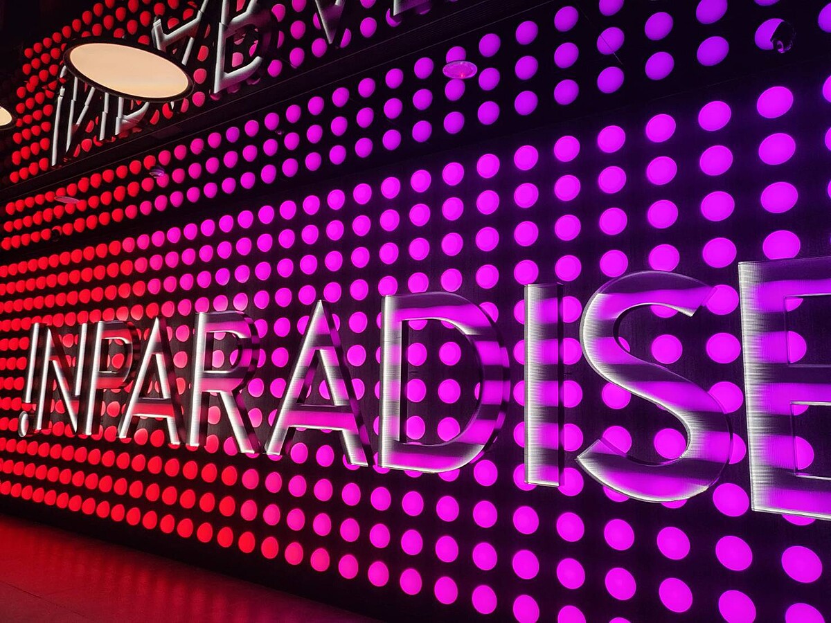 可以看到饗饗新莊店迎賓燈牆上霓虹光流動炫染、光影映襯的INPARADISE字體,為「珍貴時刻,一起饗饗」的盛宴拉開序幕,以源自「TOWER」的豐富層次,結合各區特色材質與工藝手法,以前後的層次堆疊和燈光造影,與食藝美學相互呼應,延續一餐區、一名店的品牌精神,打造別具風格的八大餐區景觀。