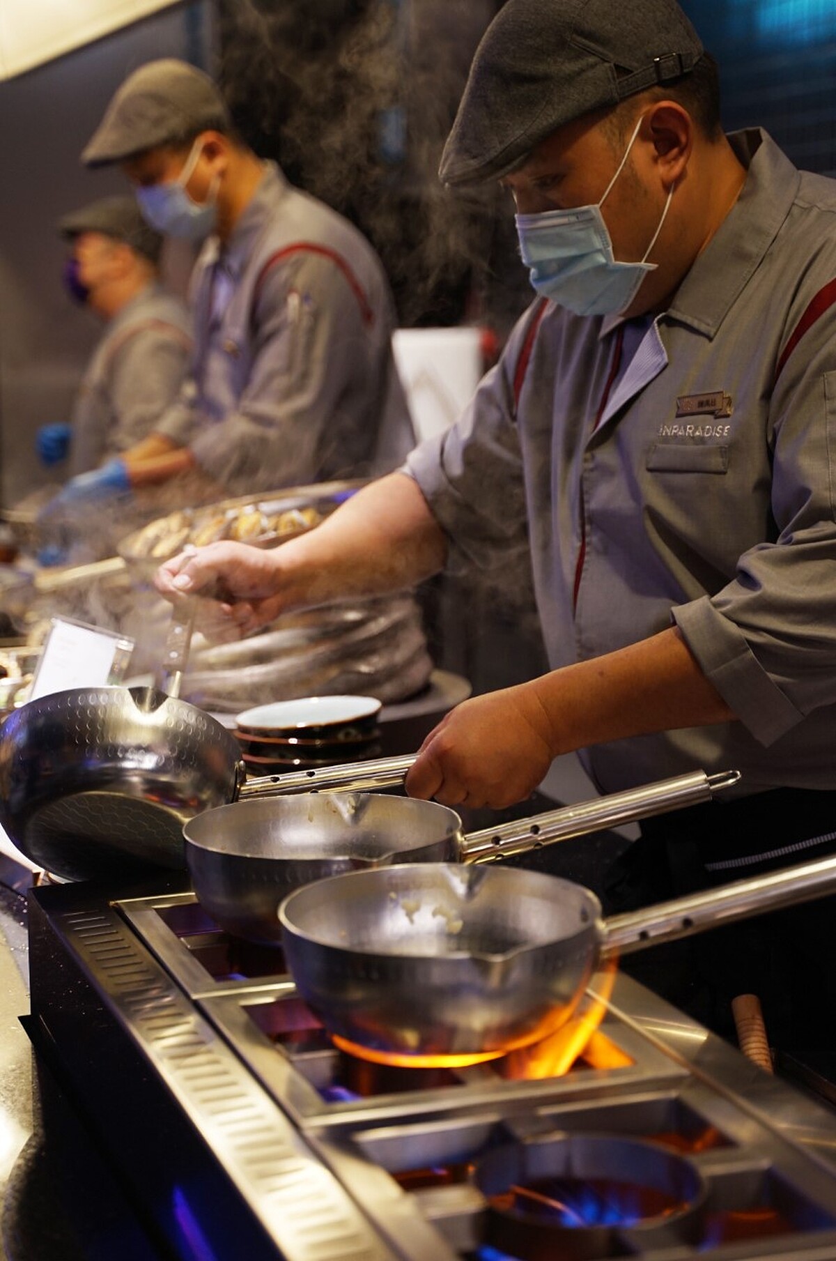 饗饗新莊店的服務人員制服更特邀臺灣首位登上紐約官方時裝週的JUST IN XX品牌設計師周裕穎,以時尚手法融合品牌風格與機能需求,打造專業與風格兼具的全新制服,外場主管與服務人員以知性藍色搭配織線紋理拼接與細節點綴,秀廚人員則以淺灰色為底,依所負責的料理溫度不同衣領和袖口的滾邊色澤而有紅色和藍色的差異。