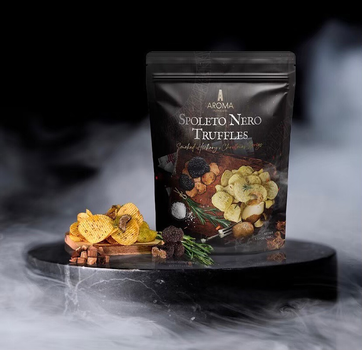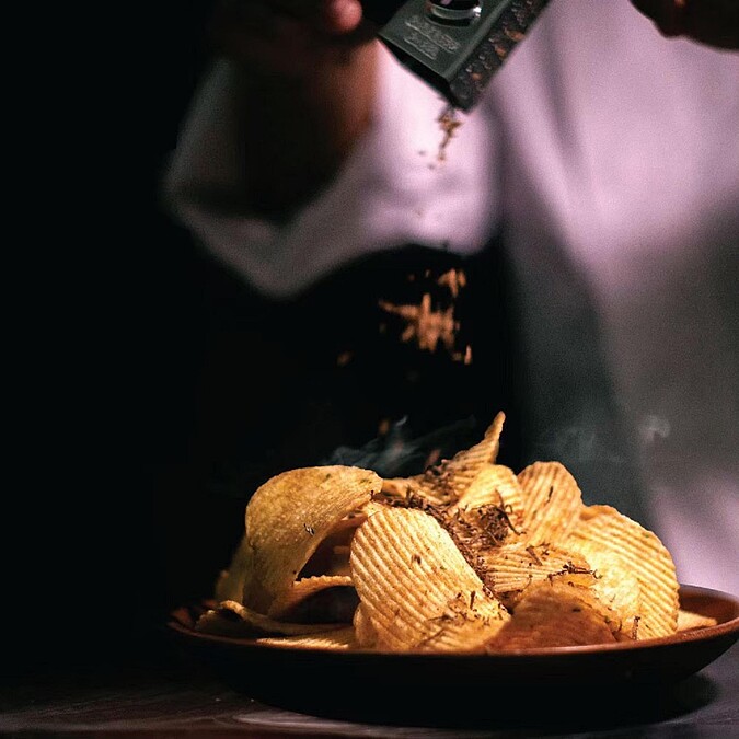 除了原味的黑松露洋芋片外,推出了全新「黑松露煙燻洋芋片」,以純手工方式100%燃燒燻製山核桃木,讓厚切波浪洋芋片上散發著獨特香氣,再將頂級義大利黑松露、槲寄生以手動攪拌,讓木質調香氣融入其中。