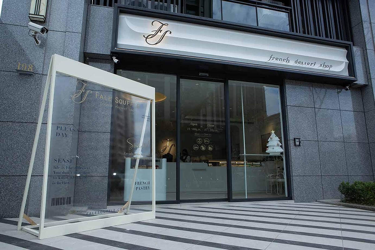 沿襲《法蕾・熊》本店的法式優雅風格,竹北概念店在店裝設計美學上,更投入極簡與細膩純淨概念,店外觀以俐落的黑白配色展現法式經典時尚,特別的是招牌上像用鮮奶油輕抹過的立體痕跡,搭配低調質感的文字美學,更凸顯精品甜點專賣的奢華品味。而店內則統一以純白視覺打造,以「漫想層境」為發想,用「圓弧」、「層疊」元素融合在空間裡,藉此呈現出舒芙蕾的溫潤圓滑的口感、即千層蛋糕的細膩層次。