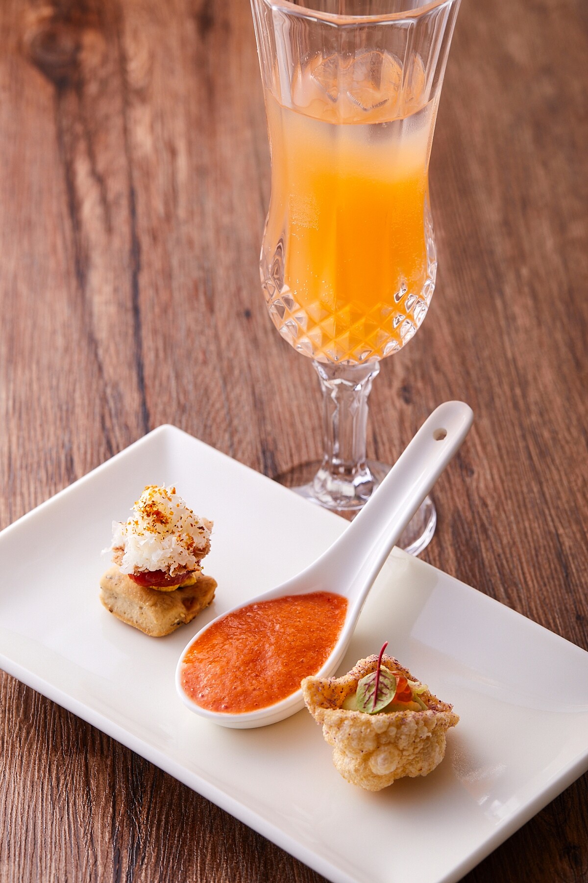 靈感取自南義居民對於貝類海鮮的熱愛所研發出傳統貝殼麵,需耗時六小時製作,僅一口大小的鮭魚卵貝殼麵點,外殼酥脆內餡豐美,清爽開胃。