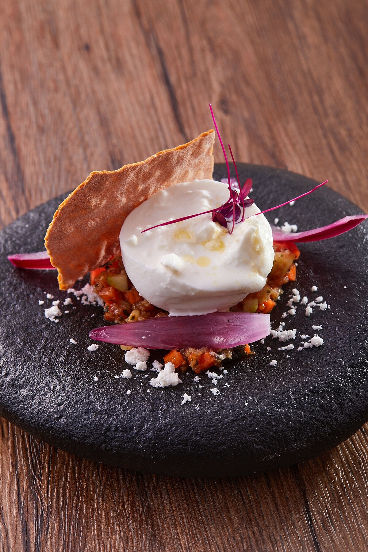 預先醃漬至酸香的蔬菜丁與奶香濃郁口感清爽的起司,以及酥薄羅勒葉的絕妙可口組合,則是向14世紀起便風靡全義、推崇自由混和蔬菜並以食醋調味的古羅馬食譜致敬之作。