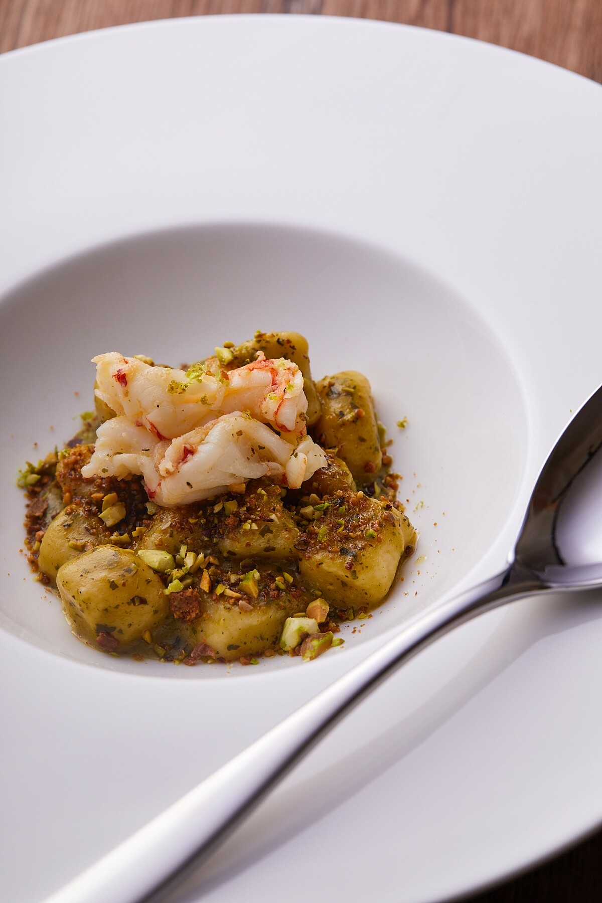 手工馬鈴薯扭奇佐開心果青醬搭甜蝦