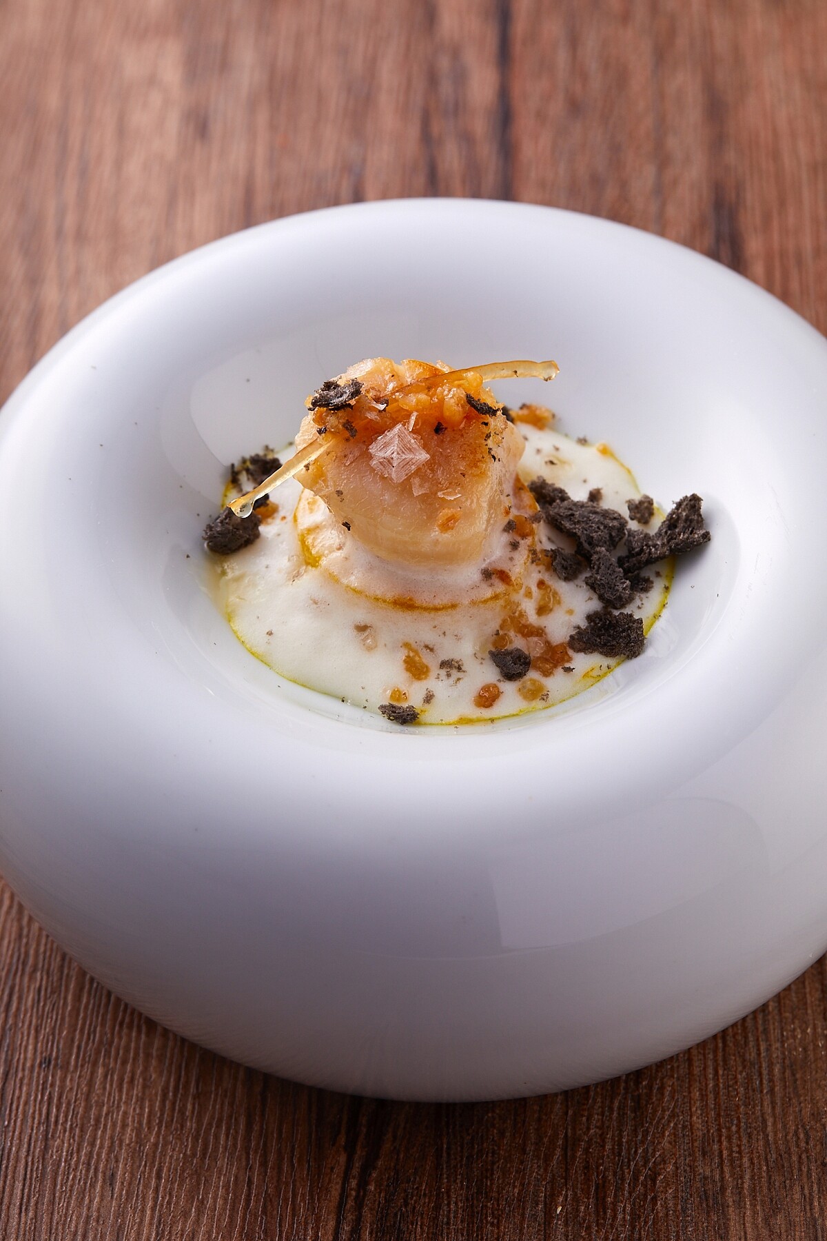 北海道干貝墨魚脆酥及馬鈴薯泡泡和糖漬檸檬