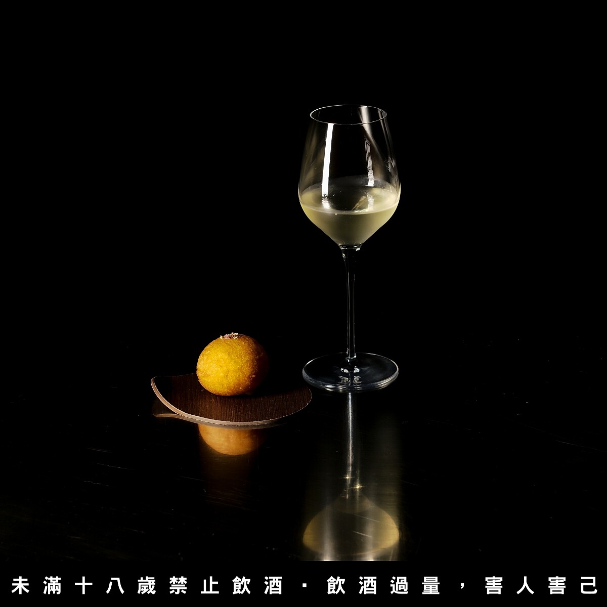 第一道即端出 MUME 經典菜色,以重口味的「Wagyu tartare」直球對決作為開場,在和牛塔塔中拌入蛋黃醬,加入菜脯跟醋漬洋蔥帶出酸度與爽脆口感,開胃之餘,也有著明確的 MUME 風格。第一杯搭酒,以血紅色呼應著牛肉的色澤,清新的莓果酸度帶點微氣泡,結合淡淡木質調,並加入意想不到的材料—「醬油」,引出一絲奶油風味和 umami 的醬香。