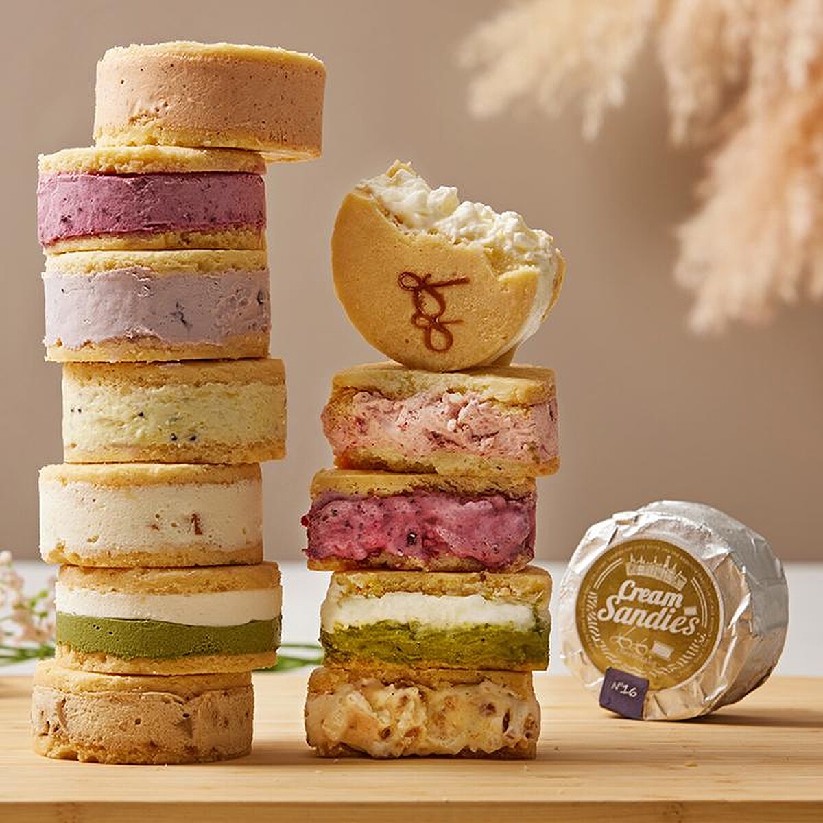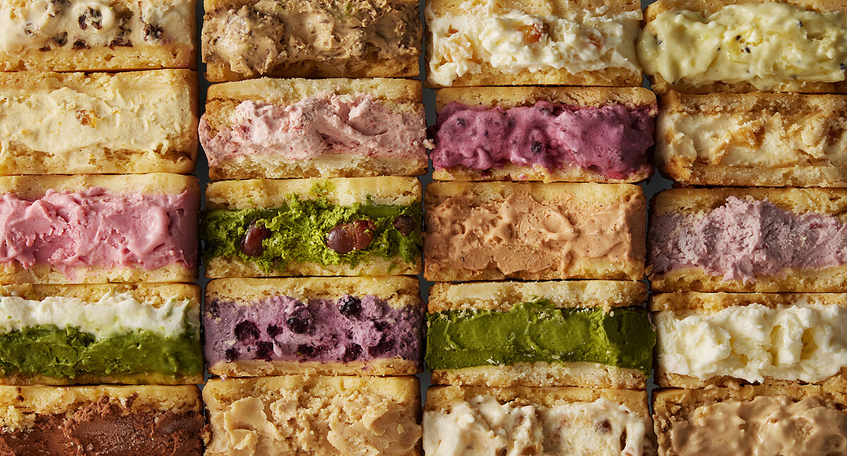 由四葉鮮奶油乾酪、酪乳製成,細緻滑順、入口即化。共有和歌山水蜜桃、宇治抹茶、福岡草莓、沖繩海鹽花生、山梨櫻桃等30多種口味。入口感受香酥餅乾與厚厚北海道奶油冰淇淋內餡,品嚐四葉乳品香濃的奶香與清爽口感真的是太幸福啦!