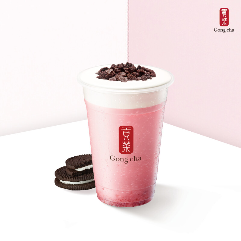 以酸甜的草莓奶綠為基底,再淋上招牌的綿密奶蓋,最後撒上OREO碎片,打造豐富口感與充滿驚喜的幸福滋味!