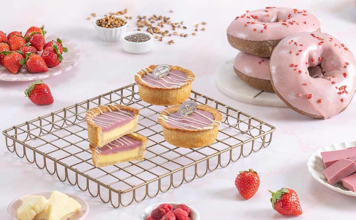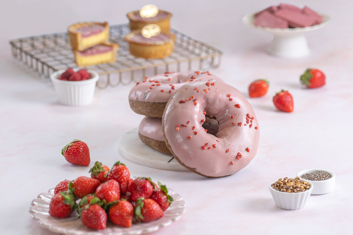 春季繽紛限定。黑麥雜糧麵包內餡搭配草莓果乾與覆盆莓果泥、奇亞籽,比利時紅寶石巧克力淋面,點綴草莓碎粒,以俏皮甜甜圈童趣造型呈現,好看又好吃。