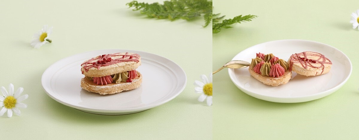 花樣著繪達克瓦茲盛夏花園(伯爵茶覆盆子),以乾燥樹莓碎粒、紅寶石巧克力製成,充滿初春夢幻氛圍感的精緻歐式茶點,有著甜而不膩的清新口感。