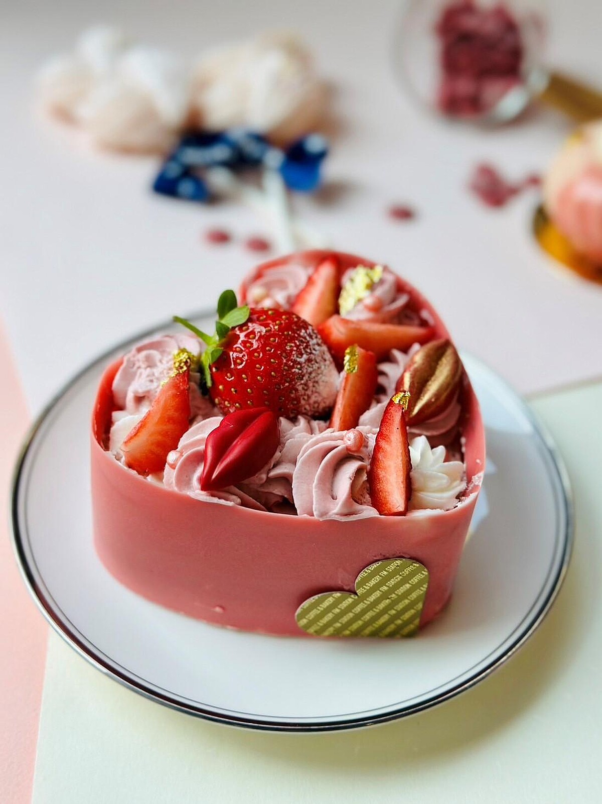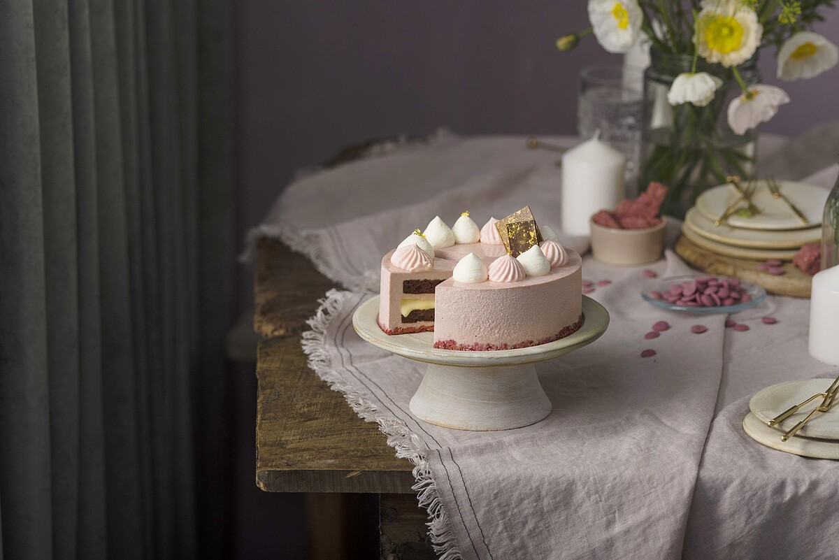 以Ruby紅寶石巧克力為基礎,搭配無麵麩香草蛋糕,並以草莓果醬、新鮮草莓、草莓脆餅來點出酸甜清爽滋味,共有6吋與8吋兩個尺寸可以選擇。