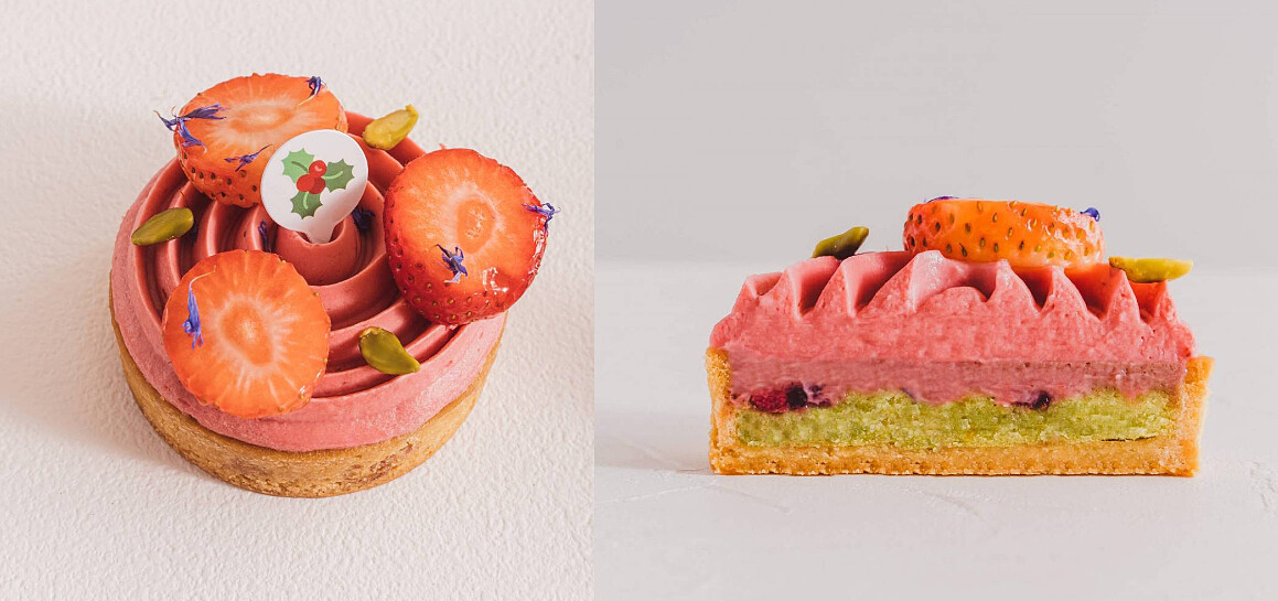 紅寶石巧克力、紅莓香緹、草莓奶凍、開心果杏仁奶油餡、原味塔皮烘培出的酸甜多層次水果塔,直擊所有甜點控的少女心。
