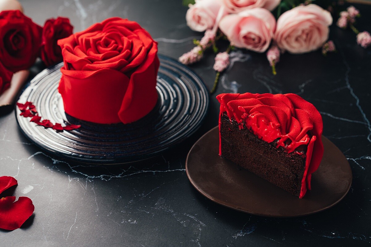 蛋糕本體以高濃度比利時巧克力為原料,在湯種巧克力戚風蛋糕中夾入甜而不膩的生巧克力內餡,擬真的紅玫瑰搭配上苦中帶甜的濃郁巧克力風味,每一口都是幸福滋味,是一款視覺與味蕾兼具的完美情人節蛋糕之一,絕對會讓另一伴超驚喜!