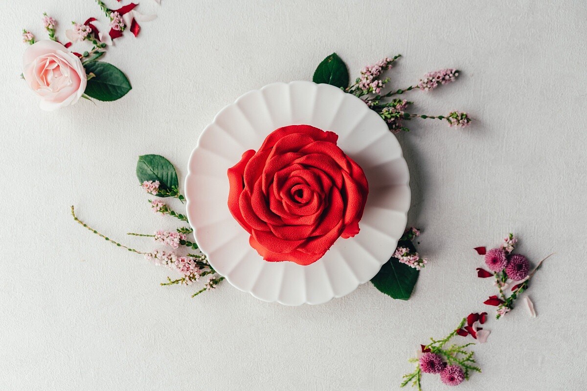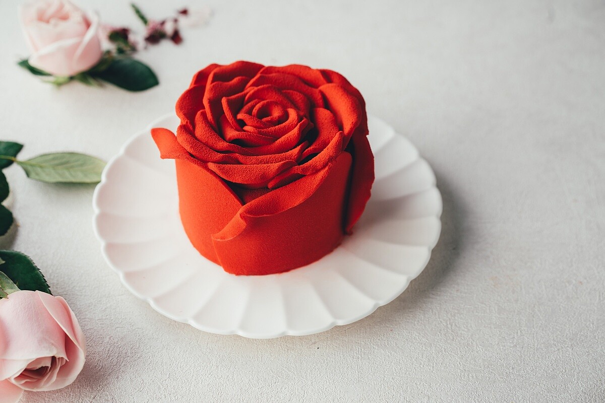 蛋糕體採用高濃度比利時巧克力製成,在濃郁的巧克力戚風蛋糕中夾入生巧克力內餡,擬真的紅玫瑰搭配上苦中帶甜的濃郁巧克力風味,甜而不膩口!