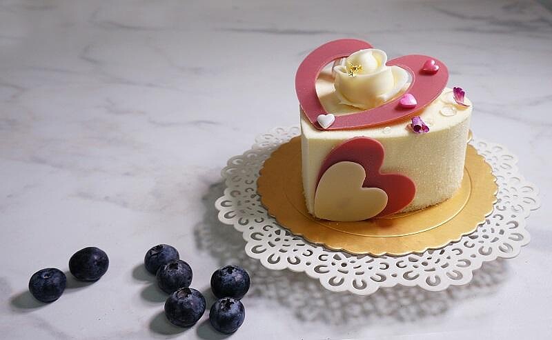 以厚實的巧克力海綿蛋糕為基底,再搭配自製的藍莓慕斯與酸甜的藍莓凍,外表則是以提拉米蘇更增添整體層次與口感,最後再將紅寶石巧克力製成愛心形狀點綴蛋糕,是一款優雅又迷人的情人節蛋糕!