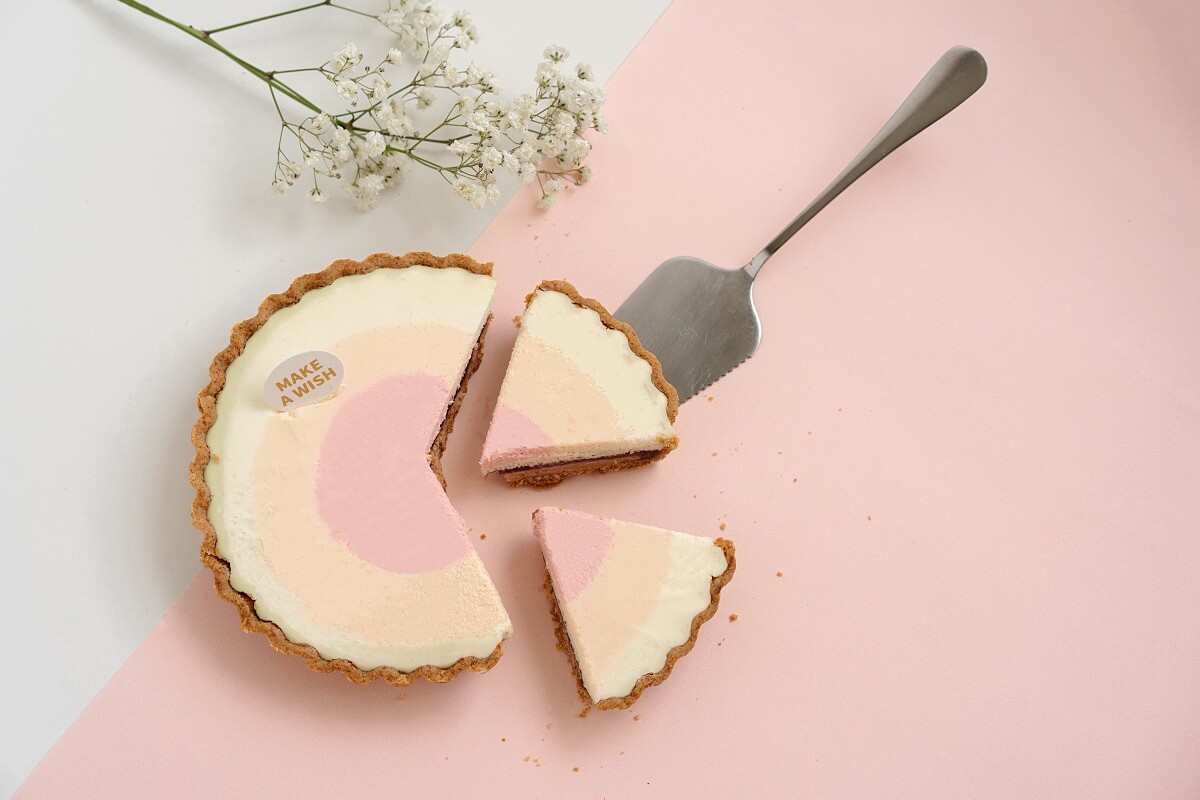 亞尼克情人節夢幻新作!加入帶有濃郁乳香與清爽酸味的北海道奶油乳酪,以迷彩漸層手法創作出粉嫩吸睛且質地細膩的慕斯,再搭配草莓凍增添酸甜風味,並以草莓巧克力酥菠蘿和充滿奶油香氣的派塔堆疊層次口感,讓人每一口都充滿驚喜感!