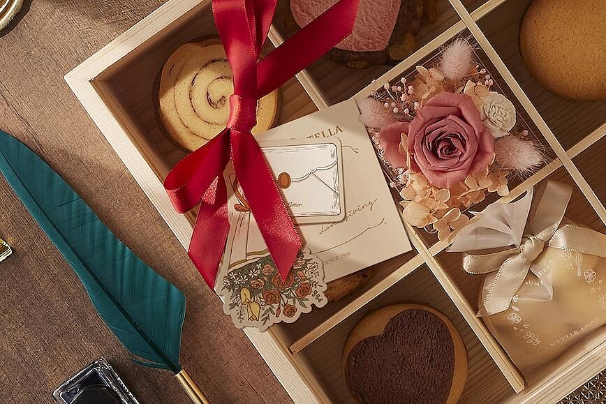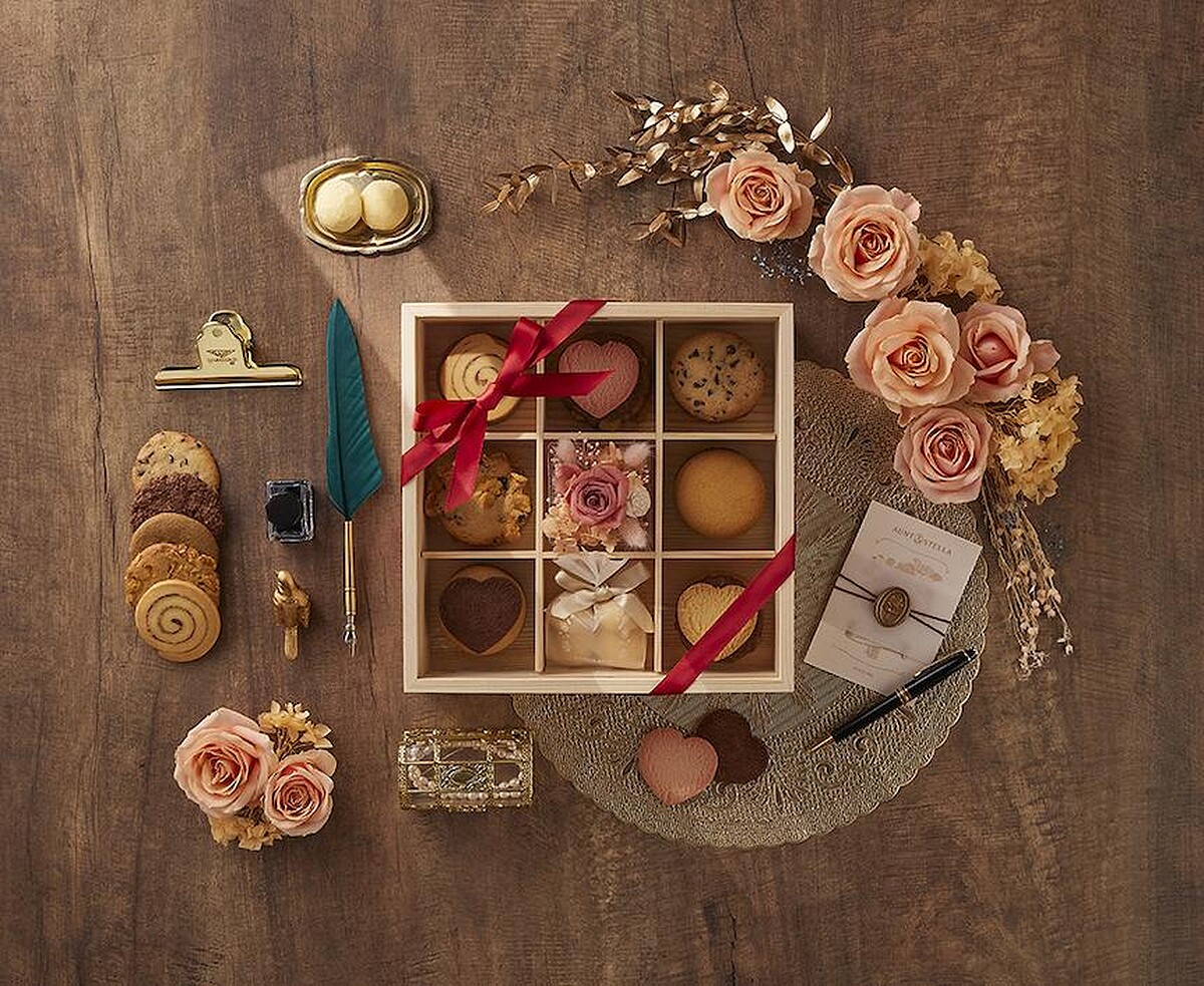 此外,凡購買任一款Aunt Stella 詩特莉禮盒,可以加價20元選購精緻的情人節花束與信封造型吊卡。品嚐完畢後,九宮格木盒與永生花藝還可以當作收納盒或擺飾使用,非常實用,延續Aunt Stella 詩特莉秉持「家飾型禮盒」之永續環保理念。