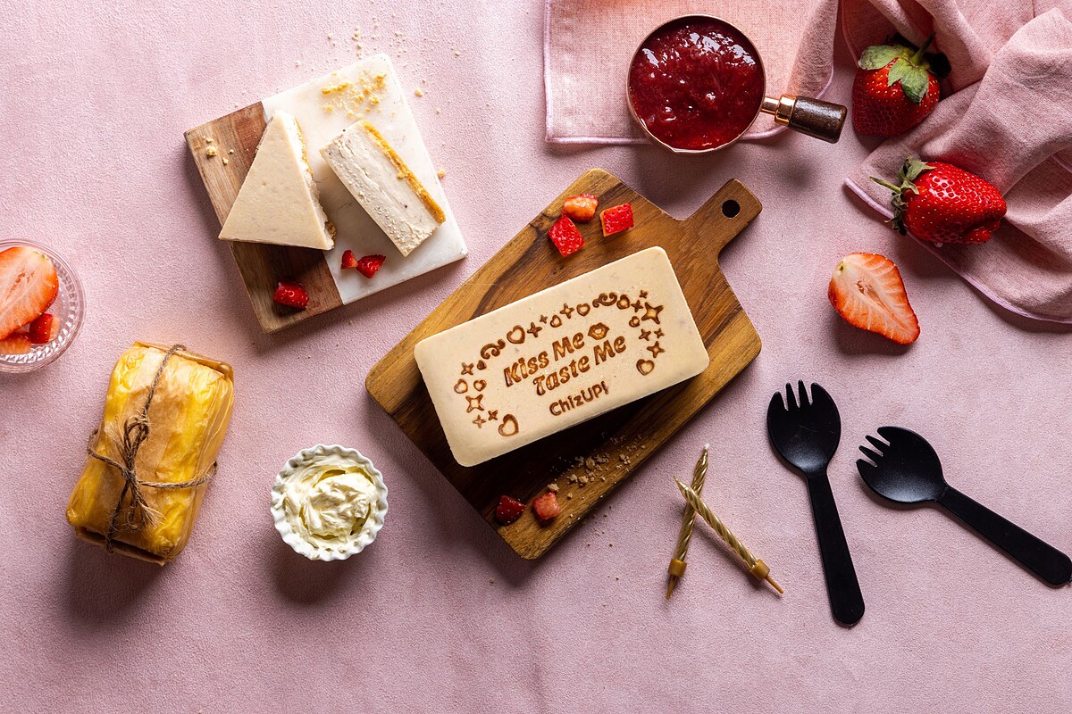 在蛋糕上烙印甜蜜情話 「Taste Me, Kiss Me」讓情侶們高調曬愛甜到心坎裡!一共有3款口味可以選擇,分別有黃金起司、濃情重巧克力起司及雪戀草莓起司口味可以選擇。