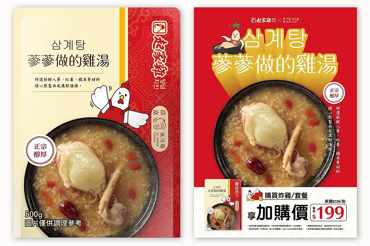 起家雞攜手以歐盟頂規氣冷設備製成的洽富氣冷雞™,聯名推出起家雞「蔘蔘做的雞湯」居家調理包,讓你在家也能輕鬆享受道地「韓式風味」!以人蔘、紅棗、枸杞、糯米等多樣藥材熬製的人蔘雞湯,選用冷空氣降溫製程、完整保存肉汁與鮮甜的洽富雞腿肉,口感軟嫩Q彈、鮮味十足!糯米粒浸滿雞湯香滑綿密,讓人吃一口彷彿置身頂級藥膳響宴!