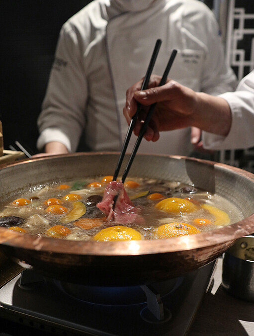 湯底使用香氣濃郁的大片北海道利尻昆布加入靜岡產的枯本節鰹魚製作,再加入甜度超過16的完熟金桔與九州黃金柚子(YUZU)一同熬煮,透過火鍋湯底的溫度香氣延伸置於上方的蒸籠內,讓裡頭切片的金桔與宮崎A5和牛高溫蒸90秒,開蓋後噴灑上柑橘燒灼,再加上以完熟金桔與柚子胡椒調製的金桔醬一起食用,豐腴的和牛飽口卻清爽萬分。