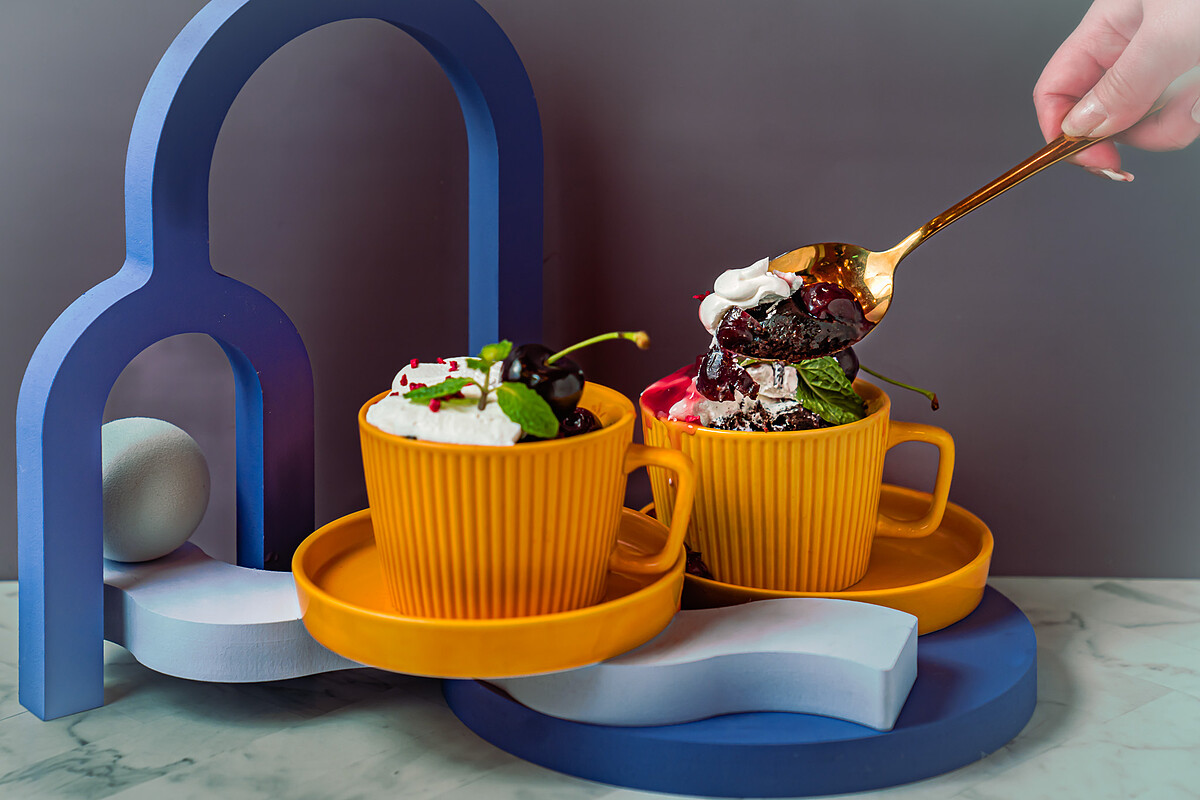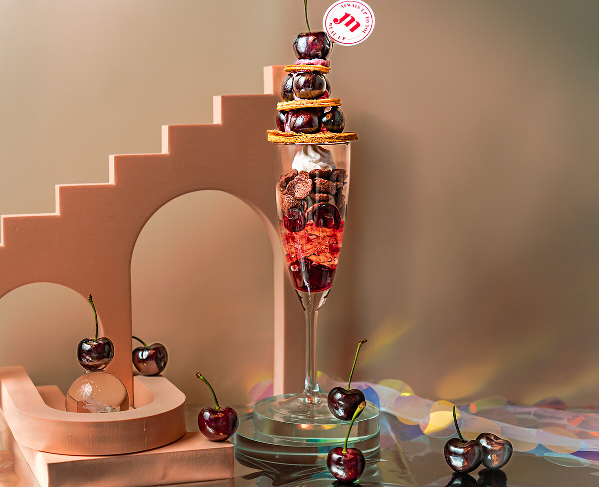 在優雅的香檳杯中加入果凍、櫻桃、巧克力脆皮及鮮奶油,再擺上千層酥及整顆新鮮櫻桃,有別於草莓高塔的浮誇,這款櫻桃帕妃的造型與風味則是走優雅路線。