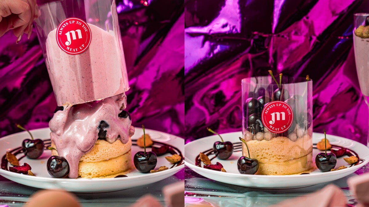 《Meat Up》招牌舒芙蕾搭配Q彈白玉珍珠,再放上數十顆新鮮甜的櫻桃後,再淋上自製櫻桃醬,拉起圍邊的同時櫻桃宛如瀑布般落下,是一款視覺兼具美味的療系甜點。