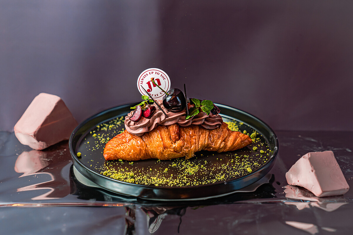 先將可頌烤至金黃酥脆,再注入自製巧克力鮮奶油,接著擺上新鮮櫻桃增添風味,最後以抹茶菠蘿酥點綴,入口感受香濃的巧克力香氣,伴隨著櫻桃的酸甜與菠蘿酥的奶香味,整體口感豐富多層次。