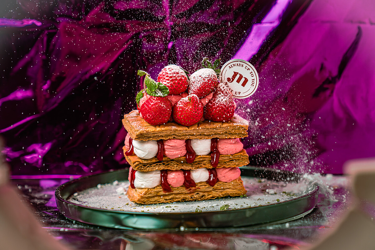 以香酥千層為基底,再擠上原味、莓果鮮奶油作為夾心,加入少許酸甜莓果醬,堆疊三層後再擺上數顆新鮮草莓,香甜多層次,讓人忍不住一口接一口。