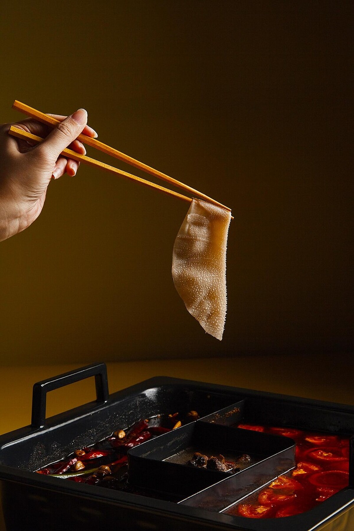加入蒟蒻元素,以大薄片方式呈現,在麻辣鍋中輕涮後,入口感受QQ脆脆的療癒口感!
