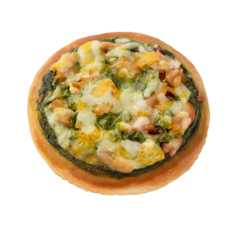 以鬆軟的酵母麵團作為披薩餅皮,接著抹上經典義式青醬,舖上嚴選燻雞片、起司絲,後過微波與回烤後的微微牽絲,讓人食指大動啊!