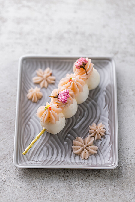 Q彈的串団子絕對是必點之一!菜單推出全新的櫻花糰子同樣以櫻花粉搭配白豆沙、鹽漬櫻花、鹽漬櫻花碎葉做成餡,將餡料做成花朵造型點綴在白色串団子上,夢幻又優雅的外觀讓人捨不得吃啊!