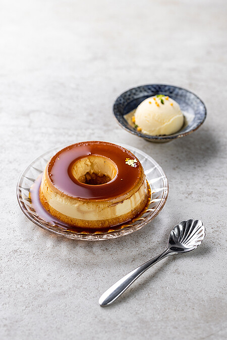 帶有濃濃復古氛圍的昭和風情布丁蛋糕,嚴選三盆糖為食材,經過三次研磨製糖工程的粒子細、在口中馬上化開,常用來製作日本高級和菓子。而全新的昭和風情布丁蛋糕口感與市售軟滑布丁口感不同,品嚐起來口感紮實卻又入口即化,搭配自製的焦糖醬甜香不膩口,再佐以撒上京都鹹米果的香草冰淇淋,別有一番風味。最上方撒上些許金箔點狀,更增添貴氣感,布丁控一定要試試!