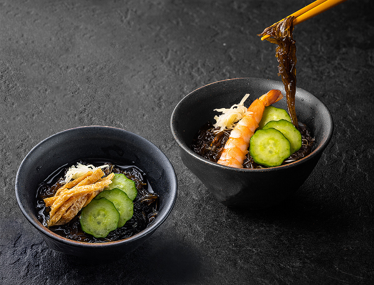 水雲是日本石垣島的特產藻類,搭配蝦子、薑絲、小黃瓜片,再淋上「京町 山本屋」負責人山本先生的黃金比例三杯酢,既美味又爽口,推薦給喜愛涼拌菜的老饕們享用。
