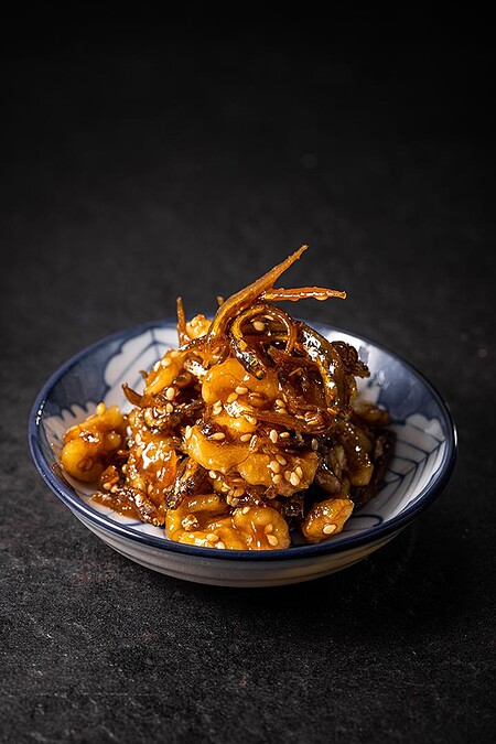 佃煮是日本傳統烹調方式之一,此道料理以醬油、糖與麥芽將食材煮到收汁,小魚乾入味、胡桃也還保有原始香氣。