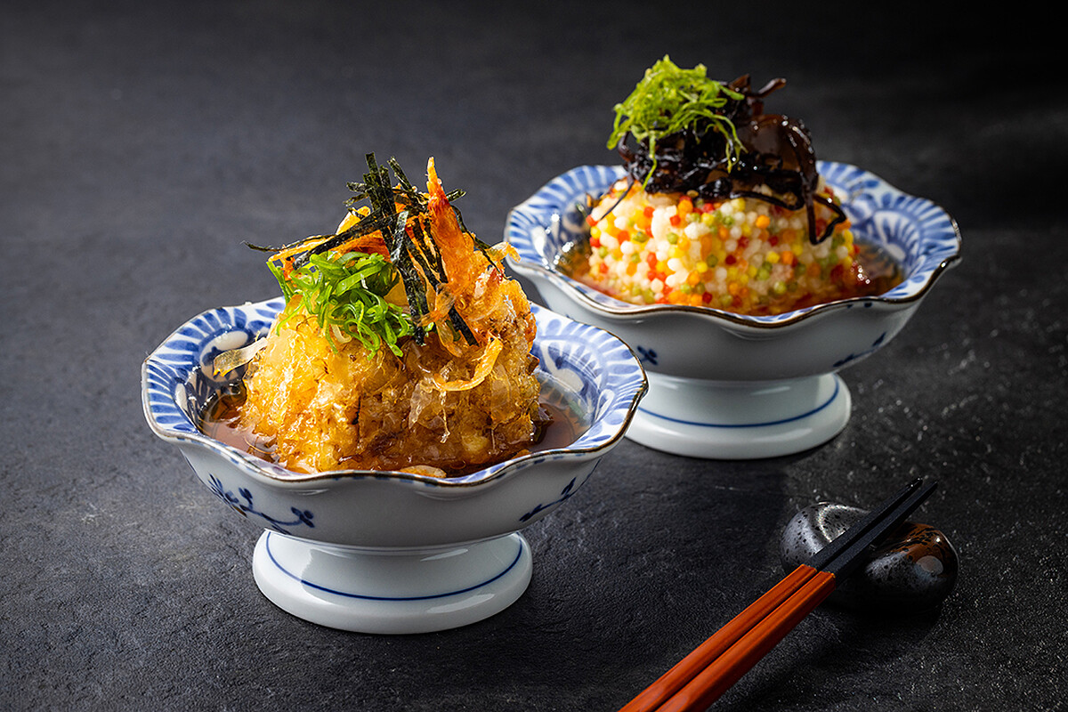 將包裹著鰹魚片的嫩豆腐炸至金黃,搭配清爽白蘿蔔泥、櫻花蝦、蔥花增添風味。將熱呼呼的炸豆腐於鰹魚高湯中,多重味覺享受一次到位。而此道料理還有素食版本,是將嫩豆腐裹以五色米果酥炸,其上綴以昆布絲、紫蘇葉絲,浸泡於素食高湯中。