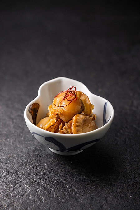 時雨煮是日料中,加入生薑一起佃煮的鄉土料理!《京町 山本屋》嚴選深受老饕喜愛的Q彈小扇貝,並撒上辣椒絲配色,看起來可口又精緻!