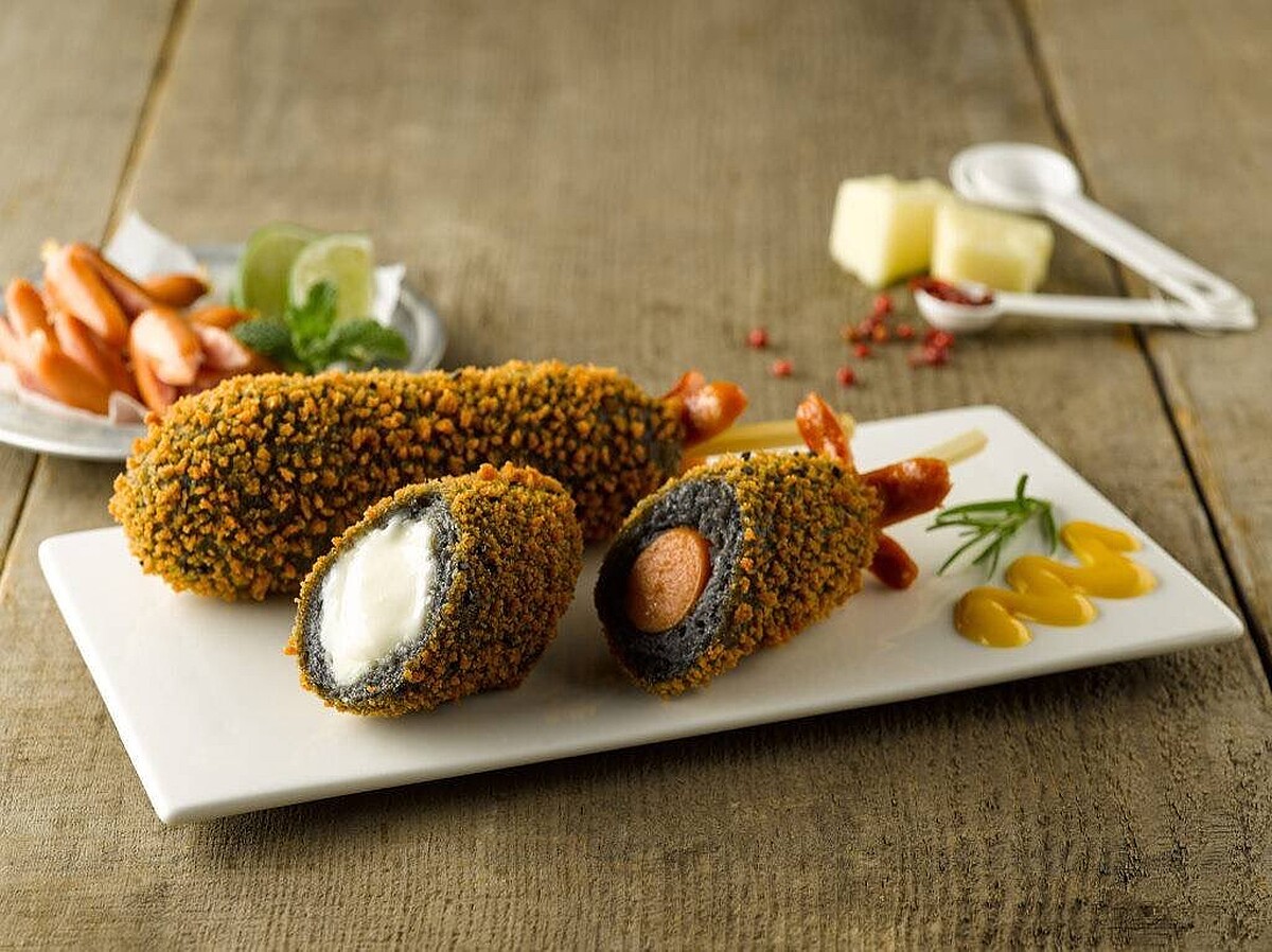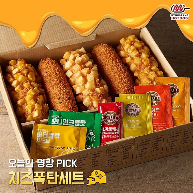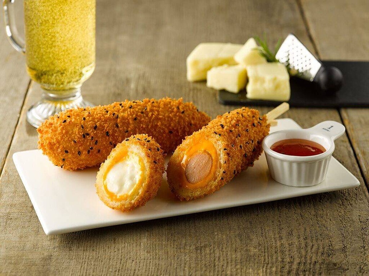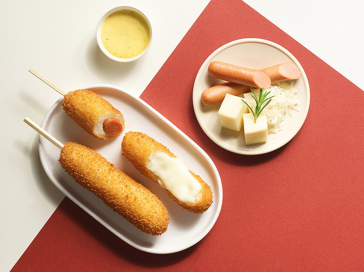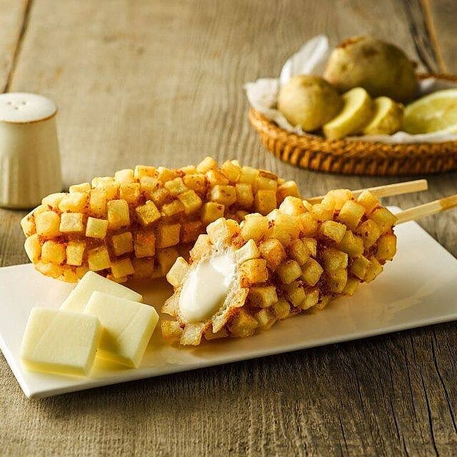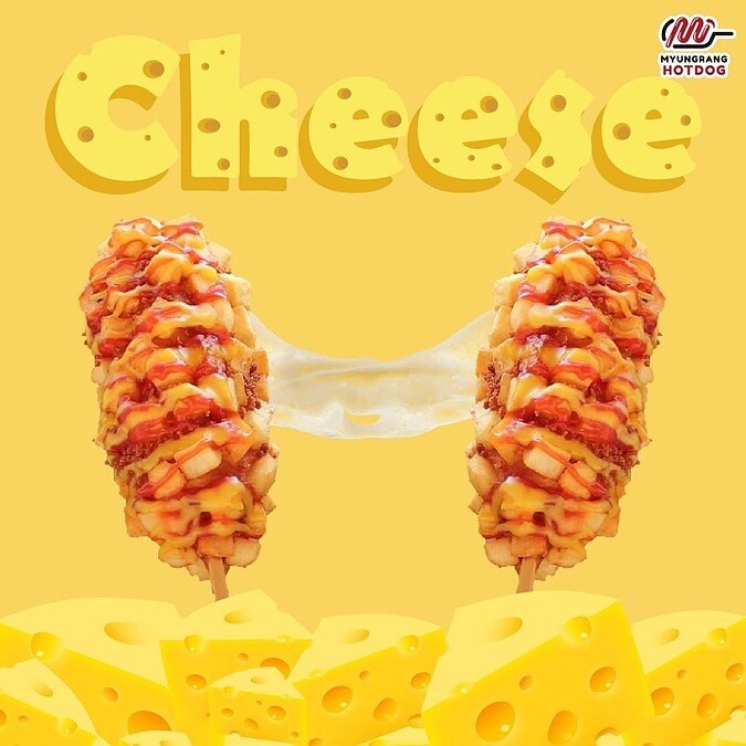 韓國「明朗熱狗」最大的特色在於外層的麵衣特別加入米發酵製成的,口感Q彈有嚼勁,再搭配各式熱狗、起司牽絲內餡,真的太誘人啦!