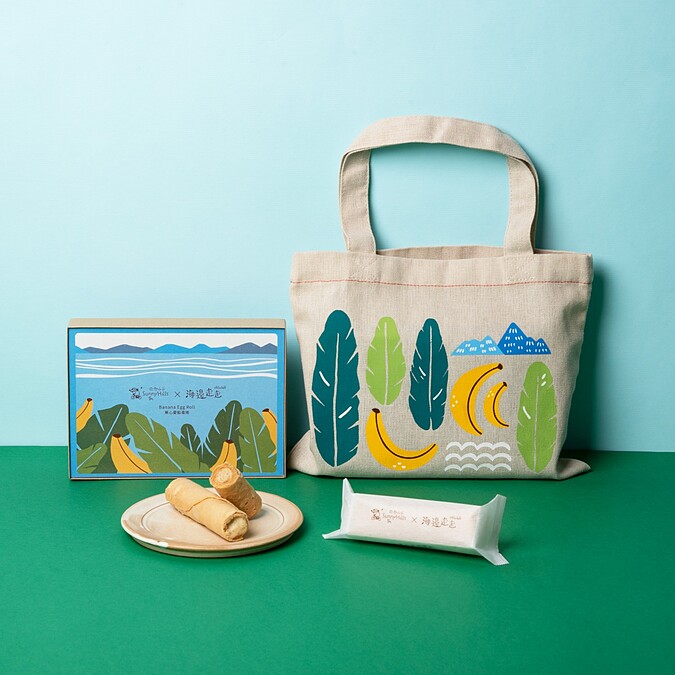 此外,「蕉心愛餡蛋捲」禮盒以牛皮紙精裝盒和聯名限量布提袋包裝,插畫中還藏有小巧思,特別加入了綠黃色的山蕉叢林、綠葉、蔚藍海洋以及波浪線條等元素,也代表了四面環海、物產豐饒的台灣。