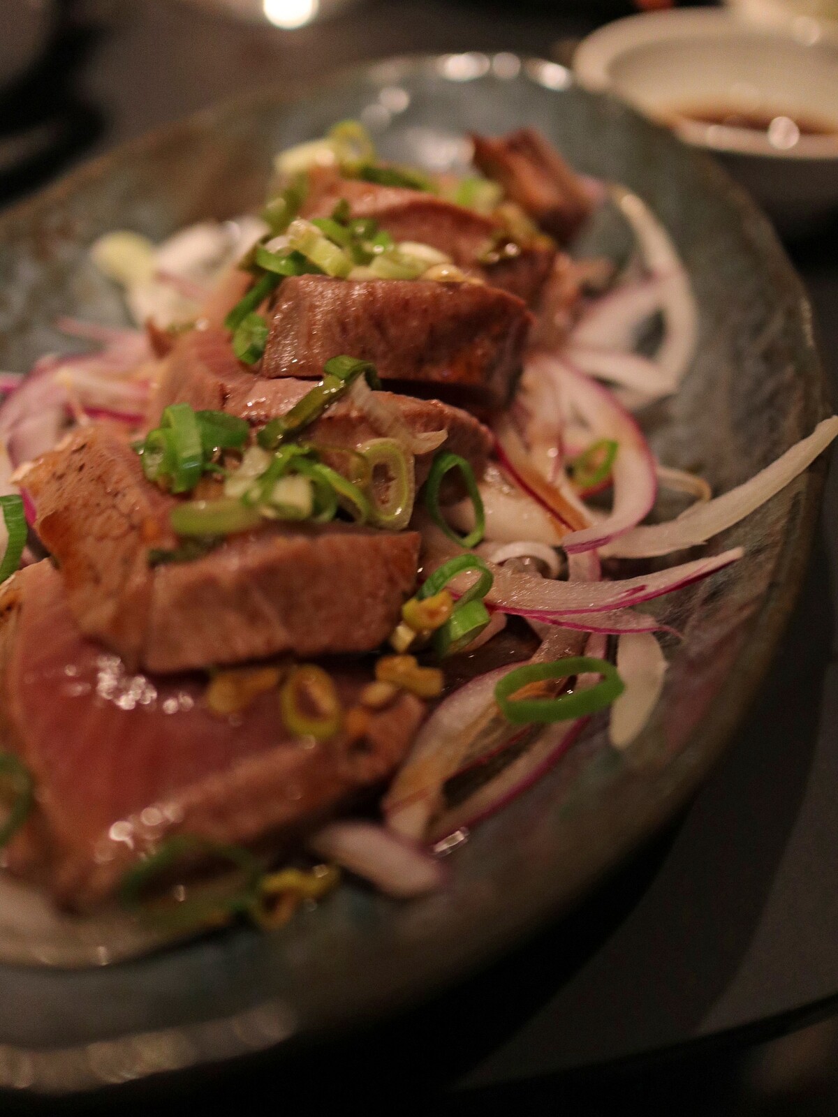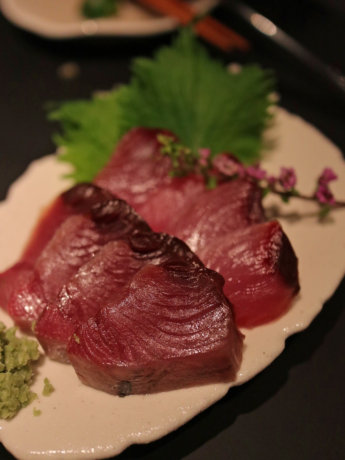 「BAR PINE 松」運用此做法,使用不易保存的八鰹,炙燒表面,柔軟豐厚的鮮美的魚肉帶著炙燒的香氣,搭配上以柑橘醬油調製的醬汁,與生洋蔥絲一起入口,味道口感皆層次鮮明。