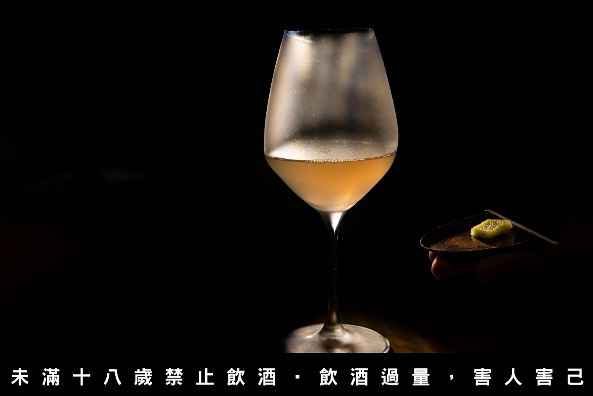 以白酒為基底,加入低發酵的四季春茶,風味平衡了花香卻偏酸的 Chenin blanc,加入台灣原生種鳥梨,並醃漬後入酒,為酒液增添了不同以往的果酸風味。並加入具有獨特土壤氣味的牛蒡於酒液中,為輕盈的酒體帶來一些穩重的氣味。搭酒小食同樣取用醃製鳥梨製成優格,夾於脆口的米紙之中,與調酒成為味道一致協和的搭配。