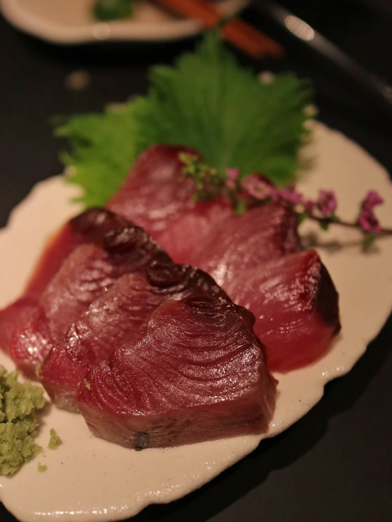 「BAR PINE 松」運用此做法,使用不易保存的八鰹,炙燒表面,柔軟豐厚的鮮美的魚肉帶著炙燒的香氣,搭配上以柑橘醬油調製的醬汁,與生洋蔥絲一起入口,味道口感皆層次鮮明。