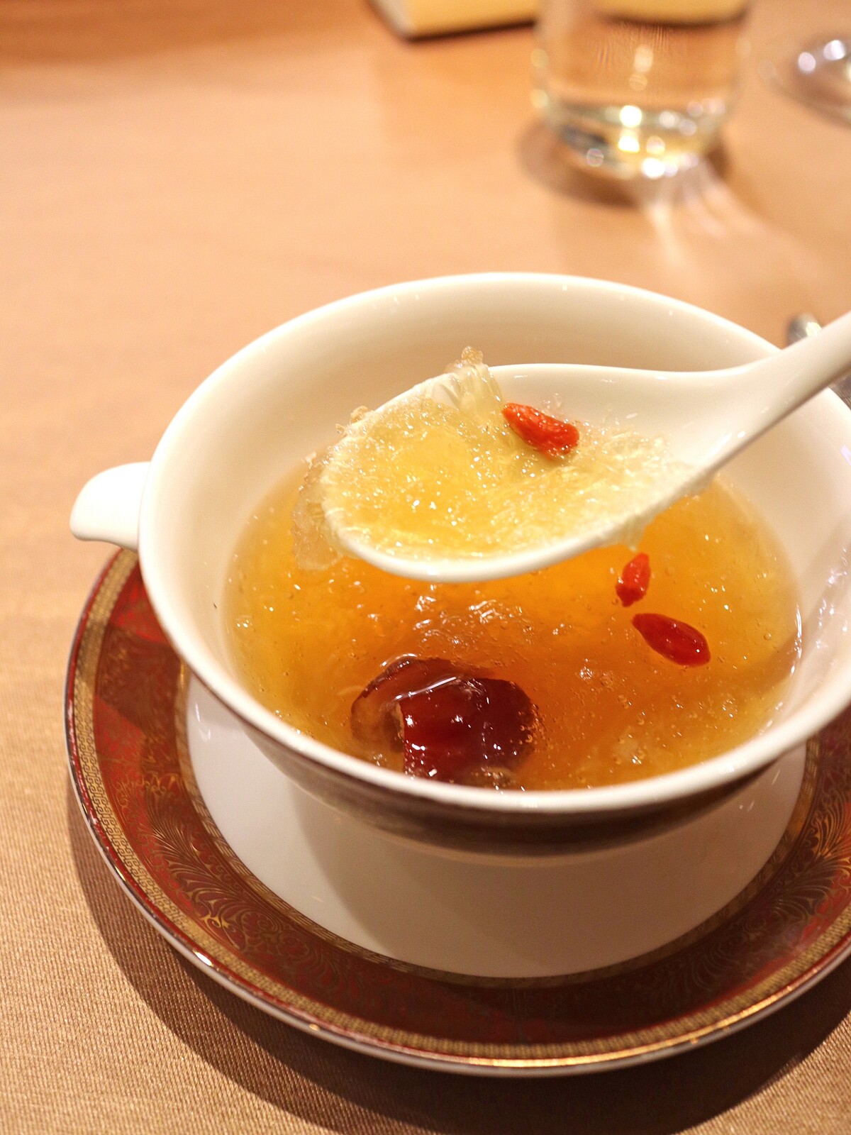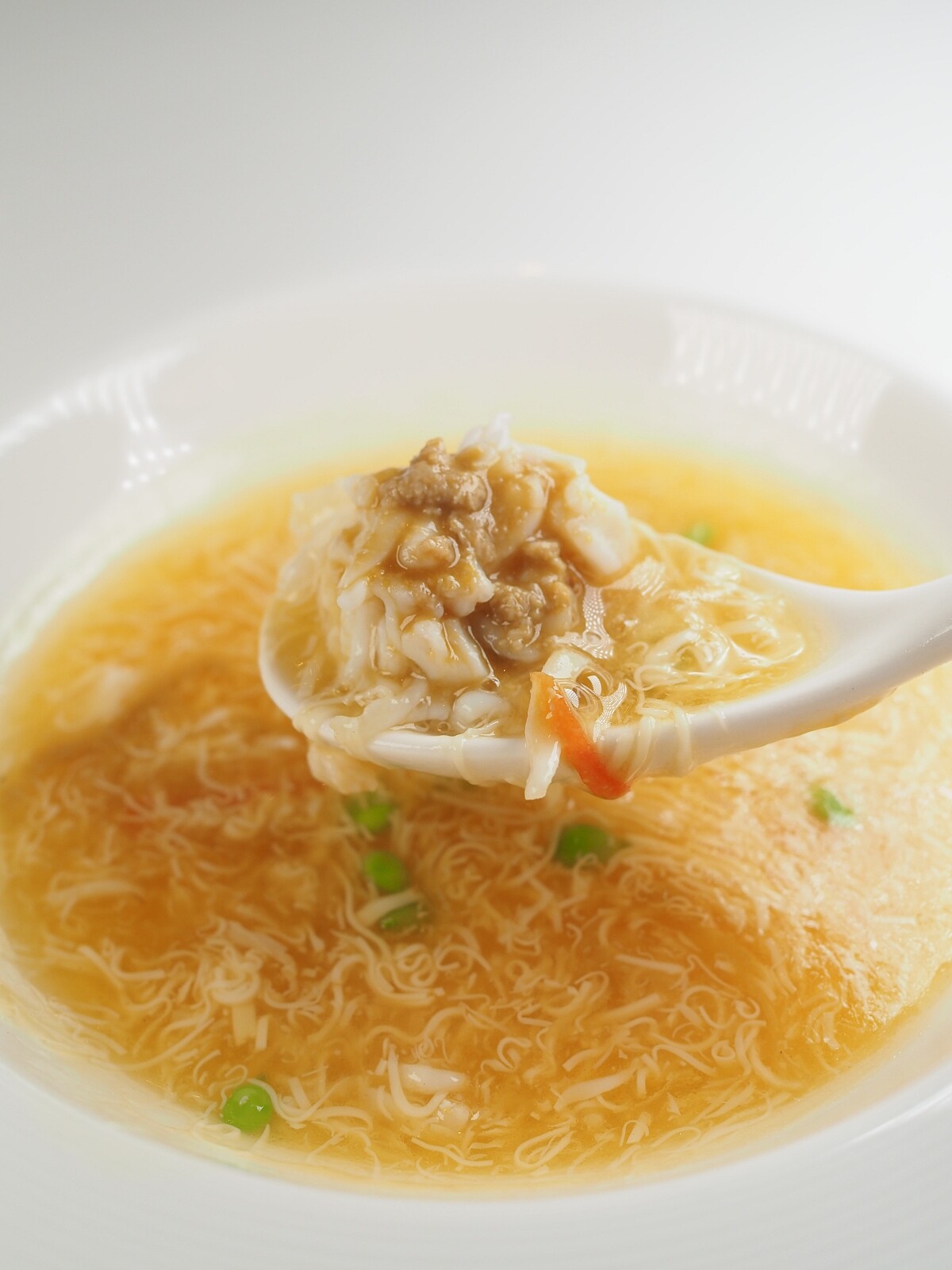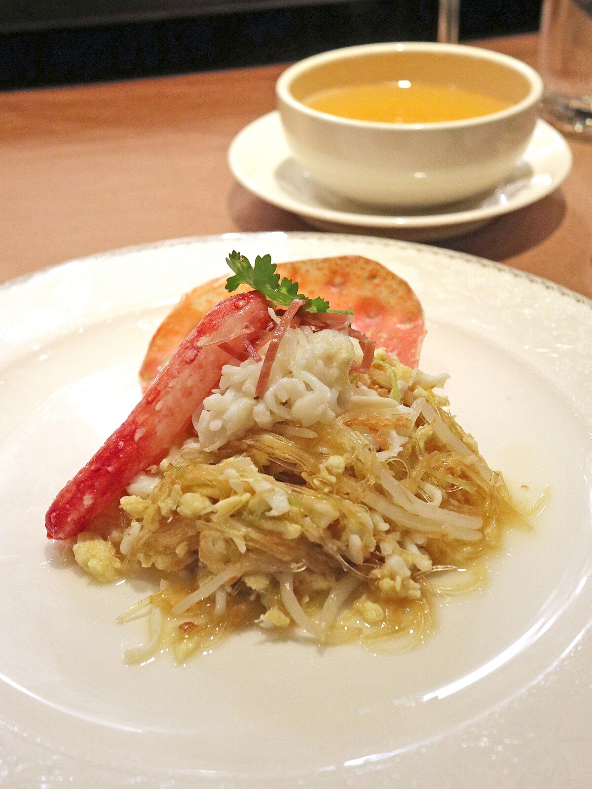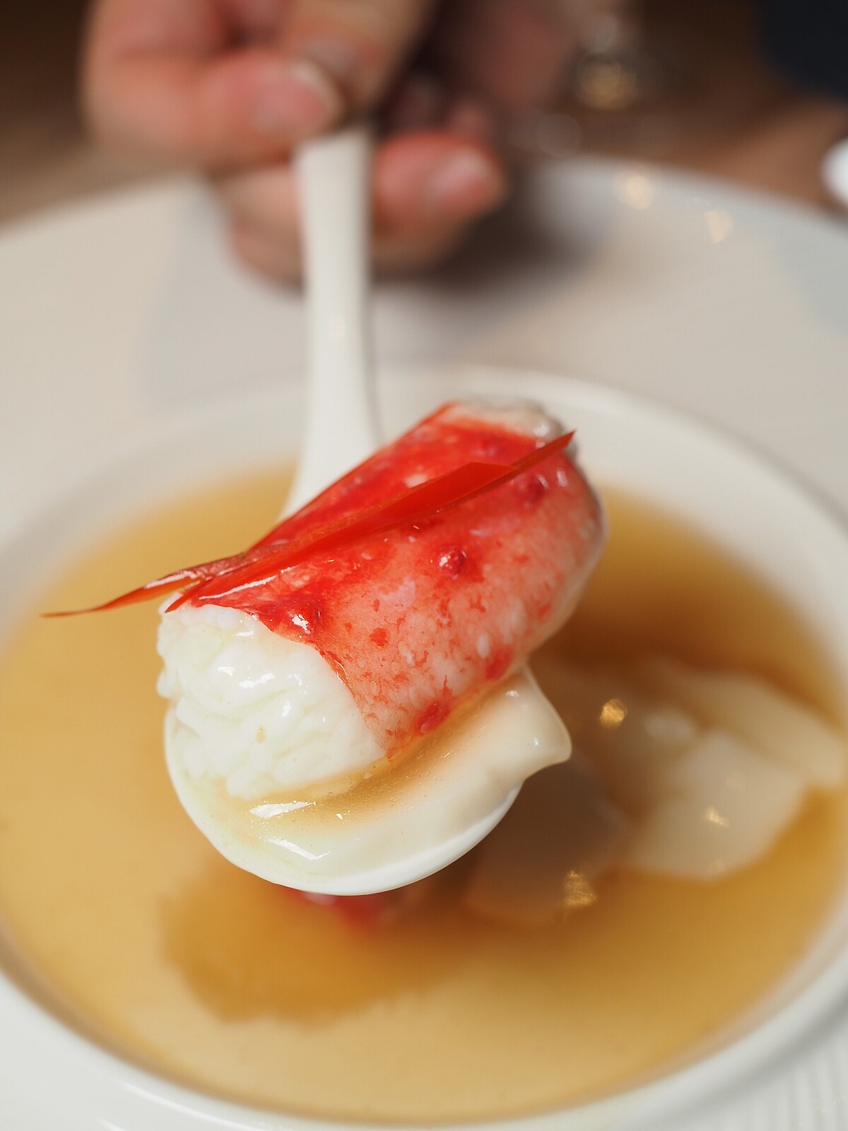 日本北海道鱈場蟹肉質結實鮮甜具有濃厚的香氣,搭配耗食且工序繁雜的魚翅,透過浸、泡、蒸且去骨去雜後,盛入黃金桂花炒蛋及特別熬製的清雞湯。最後以一口蟹肉桂花魚翅、一口湯作為搭配品嚐,扎實的用料且吃得到主廚其深厚的功力,是道清爽暖心的開場料理。